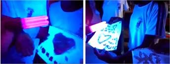 Figura 3 – Desenhos dos alunos expostos à lâmpada de luz negra, no momento final da aula