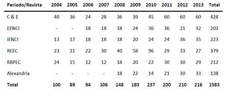 Imagem 1 - Demonstrativo da produção científica das revistas analisadas entre os anos de 2004 e 2013 por Lima, Bello e Siqueira (2015)