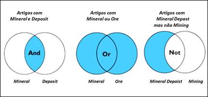 Figura 1 - Representação da utilização dos operadores booleanos como auxiliares no processo de refinamento de levantamentos de dados nos campos informatizados de pesquisa da Capes.