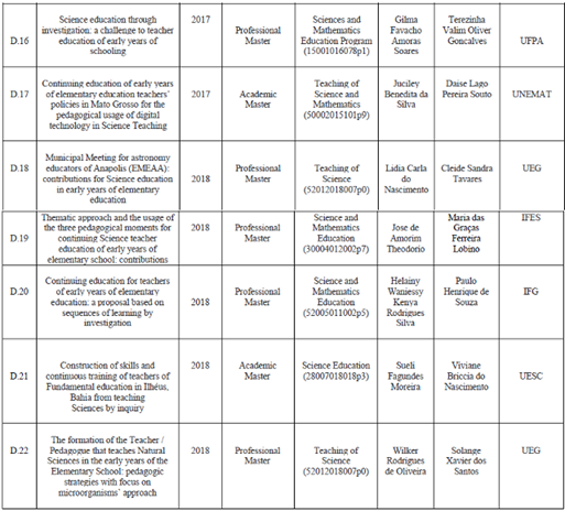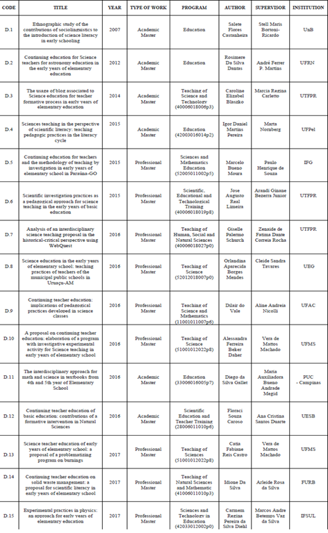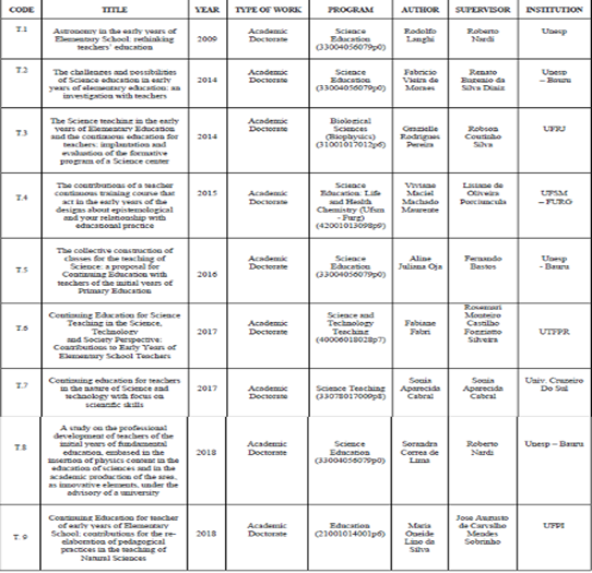 De acordo com o objetivo dessa investigação, foram selecionadas as teses e dissertações que tratam da formação continuada de professores dos anos iniciais para o ensino de Ciências, e organizadas de acordo com: o seu título; o ano da sua publicação; o tipo de pesquisa; o ano da defesa; o programa de acordo com especificação da Capes; o autor; o orientador; e a instituição de origem. Para a seleção foram levados em consideração os descritores presentes no título da pesquisa, a leitura dos resumos e, quando necessário, a consulta à pesquisa no repositório de destino, sendo classificados de acordo com um código “T.x” e “D.y”, onde “T” corresponde à tese de doutorado, “D” à dissertação de mestrado, e “x” e “y” à sua identificação específica (T.1; T.2... T.9; D.1; D.2... D.21).
