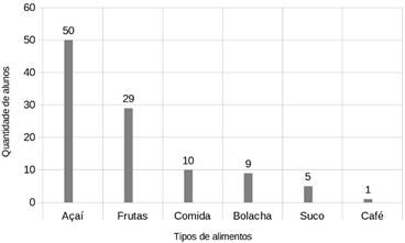 Com meu auxílio, os alunos elaboraram um questionário de pesquisa com informações relevantes para saber, dentre os alimentos citados na roda de conversa, qual o mais apreciado pelos demais estudantes. Os mais citados foram: açaí, frutas, suco, café, bolacha e comida. A tabela 1 mostra, em ordem, a preferência dos demais discentes após o levantamento dos dados realizado.