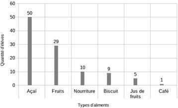 Avec mon aide, les étudiants ont préparé un questionnaire de recherche contenant des informations pertinentes à connaître, parmi les aliments mentionnés dans le moment de conversation, lequel est le plus apprécié des autres étudiants. Les plus cités sont: açaí, fruits, jus de fruits, café, biscuits et nourriture. Le tableau 1 montre, dans l’ordre, la préférence des autres étudiants après l’enquête réalisée.